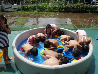 幼稚部さんは天気が良かったので プール遊びをしました(*^。^*) ライオン組さんはみんなで水に顔をつけて誰が長く潜れるか ゲームをしていましたよ♪ 顔に水がついても怖くないのかみんな 笑顔で…