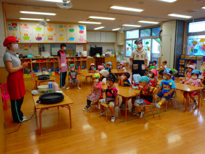 幼稚部さんは、食育活動があり ホットケーキ作りを行いました(^○^)     エプロンと三角巾をつけて準備完了! 朝からホットケーキ作りを楽しみにしている子が 沢山いましたよ♪   &nbs…