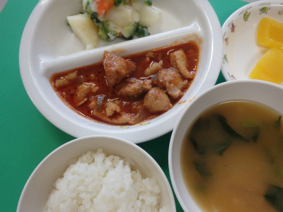 ~今日のお給食~ ・鶏肉のトマト煮 ・ポテトサラダ ・ごはん ・だいこんとこまつなのみそ汁 ・モモ ~今日のおやつ~ ・チーズボールフライ
