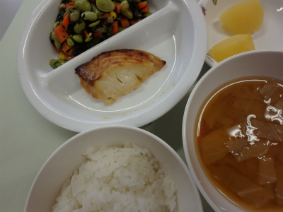 ~今日のお給食~ ・カレイの甘味噌焼き ・枝豆とひじきのサラダ ・ごはん ・キャベツとしめじのみそ汁 ・りんご ~今日のおやつ~ ・そうめん ・栗