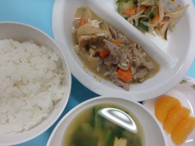 ~今日のお給食~ ・厚揚げのみそ炒め ・きゅうりの昆布和え ・ごはん ・小松菜と豆腐のみそ汁 ・パイン ~今日のおやつ~ ・フライドポテト