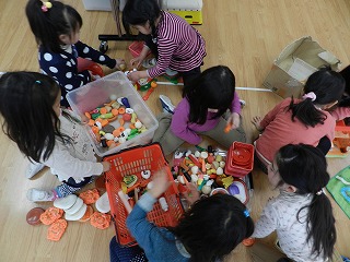 午後、幼稚部さんがひろーくお部屋を使って色んな遊びをしていたのでのぞいてみました(^o^) おままごとコーナー お買い物や料理をしていました(*^o^*) 先生もお弁当を作ってもらっちゃいましたヽ(・&fo…