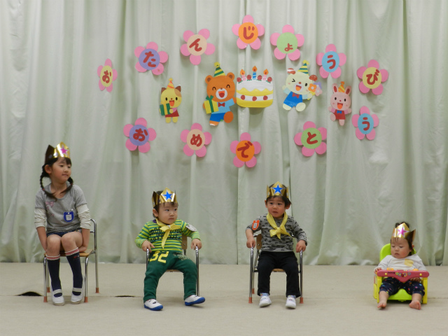 今日は4月生まれのお誕生日会がありました。新しいクラスにって初めての誕生日会❤ 今月は4人のお友達がお誕生日です!! そして先生も2人お誕生日!! お誕生日のお友達も先生も舞台の上でインダビューされて少しドキドキ☆ でも…