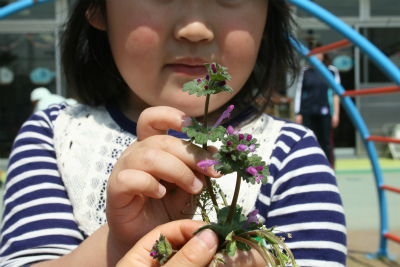 ポカポカ天気の中元気よく園庭で遊び素敵な物をみつけました。 「先生ー!こんなに見つけたよ。」 ホトケノザ。(^O^) そしてオイヌノフグリ。(^O^) お花の事はすごく詳しくて教…