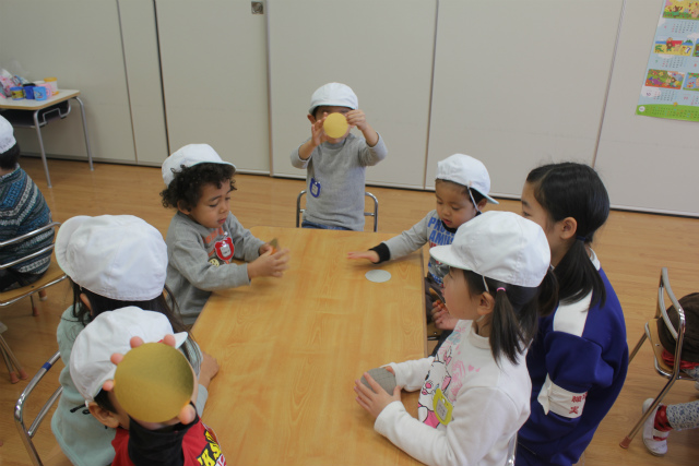 今日は縦割り保育の日! 皆それぞれのグループに集まり、楽しいゲームや工作をしています。今日はメロンパンナグループとしょくぱんまんグループの様子を覗いてみましょう。 まずは皆でメダルを制作します。 きれいなメダルにシールを…