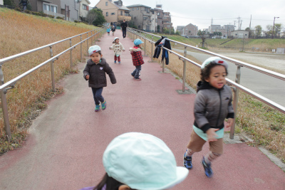 今日イルカ組さんは治水地へお散歩に行きました 治水地に着くと「ヨーイドンしたい!」という声が!体を動かすことが大好きなんですね(*^_^*) お友達や先生との追いかけっこも大好きです!「こっちだよー」と言いながら嬉しそう…