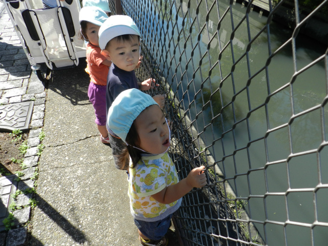昨日の台風が嘘のように、とてもきれいな青空が広がっていました。 ペンギン組さんはみんなで近くの川を見に行ったり、治水緑地に散歩に出かけてきました。 川を見ていたお友達が何か発見したようです!! …