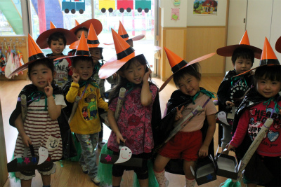 今日は英語教室の「ハロウィン」でした。 ずっと前から楽しみにしていた子供たちです。朝からそわそわしていました(^-^) 自分達で作った衣装を着てニッコリ(#^.^#)ハイポーズ!! みんなでLet’s dan…
