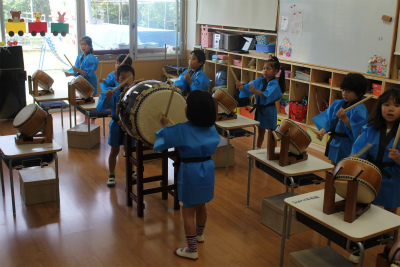 7月が始まりましたね♪ 今日は、ライオン組が和太鼓の練習をしていました。 他のクラスの子ども達も、ライオン組の勇姿を見に来ていました! ♪ドンドコドコドン♪ リズムに合わせて上手にたたいていました。 和太鼓をたたいている…