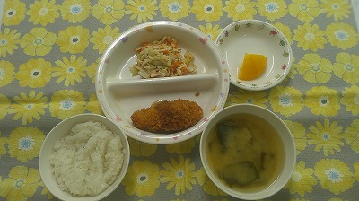 ~今日のお給食~ ・ささみチーズフライ ・キャベツのごまだれサラダ ・ごはん ・味噌汁(しめじ・わかめ・もやし) ・モモ ~今日のおやつ~ ・ホットケーキ(幼稚部は…