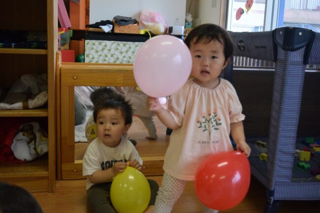 今日ペンギン組のお友達は 風船遊びをしました! いろいろな色の風船があり好きな色の風船を選ぶと ポーンと飛ばしたり、感触を楽しんだりしていました♪ &…