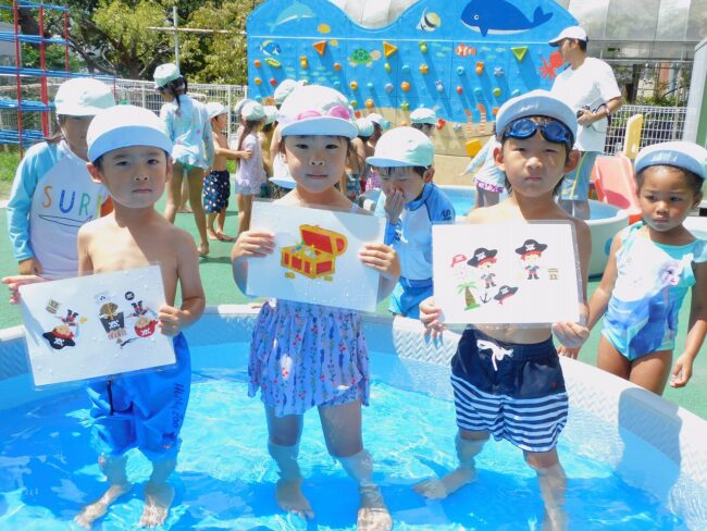 今日はプール納めがありました ラッコ組、ペンギン組とイルカ組、幼稚部に分かれて行いました ラッコ組、ペンギン組ではテラスで最後のプール遊びを楽しみました イルカ組、幼稚部は宝探しゲームを行いました イラストに描かれている…