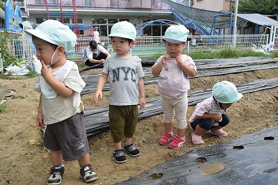 ペンギン組さんは、大根の種まきを行いました(^^)/ 小さい種を自分たちで摘んで、穴に入れてくれました! 大きい大根に育ちますように(*^-^*) その後は、テラスでプール遊びをしました♩ みんな気持ちよさそうに水を体に…