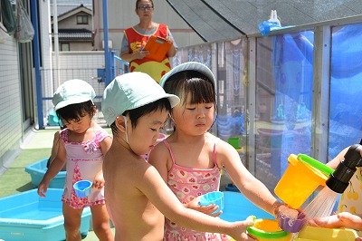 今日はイルカ組のお友達がベランダで水遊びをしました。 水遊びにもずいぶん慣れ、先生が持っているホースにも自ら向かって歩いて来たり、 バケツやジョウロに…
