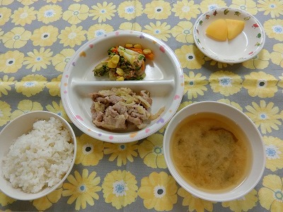 ~今日のお給食~ ・豚の生姜焼き ・ごはん ・ブロッコリーのツナサラダ ・味噌汁(わかめ、しめじ、もやし) ・モモ ~今日のおやつ~ ・わかめおにぎり ・牛乳 &n…