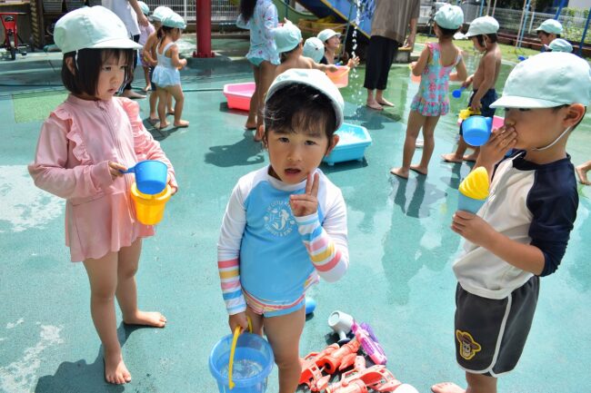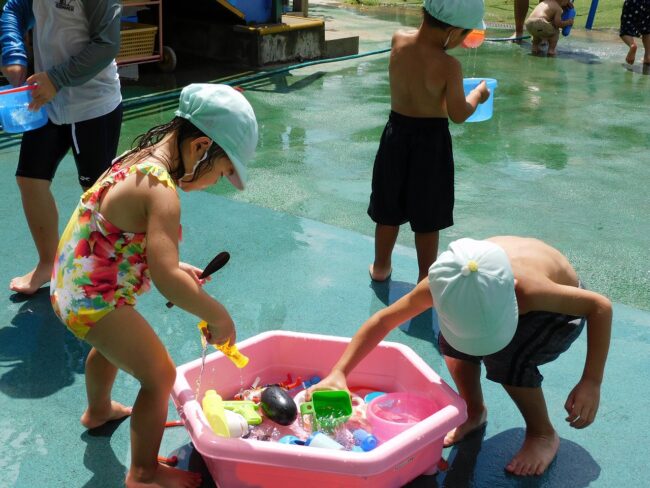 今日からお盆が明けるまで合同保育になります。 不安定なお天気でしたが、晴れている隙を見て、幼稚部も保育部も 水遊びを楽しみました。 先生やお友達とお水…