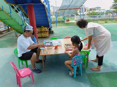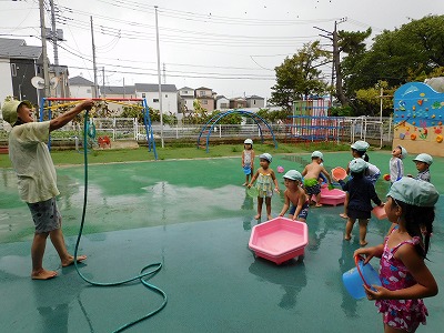 今日は、午前中に園庭で水遊びを行いました 保育部さん、幼稚部さん一緒に水遊びを行い友達と水を掛け合ったりし楽しんでいました 友達にかけるだけでなく、自分の頭に水の入ったバケツをひっくり返して 頭から流れる水を楽しんでいま…