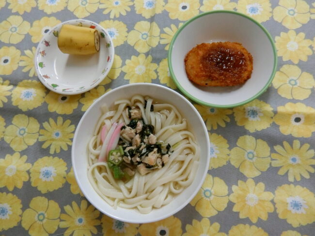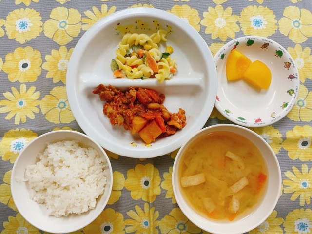 ~今日のお給食~ ・ポークビーンズ ・マカロニサラダ ・ごはん ・味噌汁(えのきたけ・キャベツ・油揚げ) ・モモ ~今日のおやつ~ ・牛乳 ・ヨーグル…