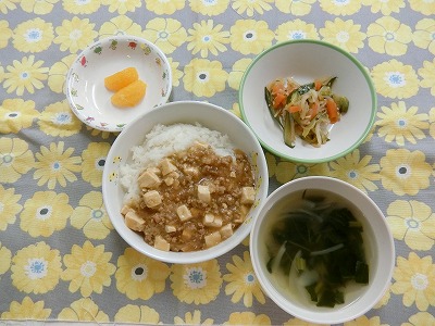 ~今日のお給食~ ・マーボー豆腐丼 ・春雨サラダ ・コンソメスープ(小松菜・たまねぎ・コーン) ・みかん ~今日のおやつ~ ・マシュマロコーンフレーク…