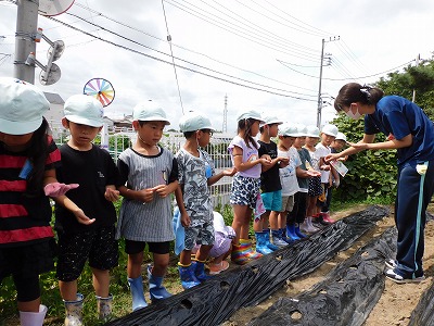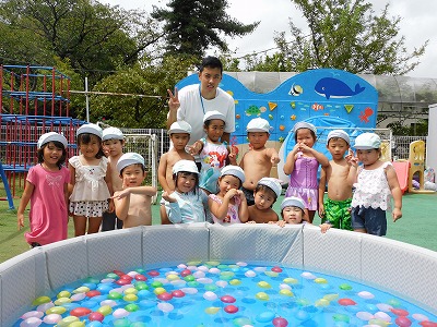 今日は、午前中に「なかよし広場」があり、プール遊びを楽しみました   在園児以外の親子にもご参加いただき、親子でプール遊びを行いましたが 冷たい水に、びっくりする場面もありましたがプールの玩具を使って水の冷たさ…
