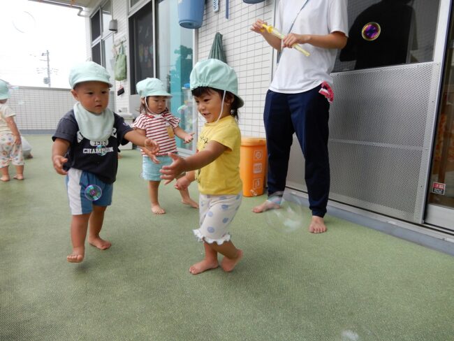 今日はペンギン組のお友達がベランダでシャボン玉遊びをしていました。     先生が作ってくれるシャボン玉を、みんな元気に追いかけていました。   大きなシャボン玉が出来ると大喜びで、パチンと…