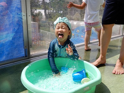 今日はイルカ組の様子です 午前中は少し蒸し暑い天気となりましたが、ベランダで水遊びを行いました 小さいプールの中に水を張り、足を入れて冷たさを感じたり、友達と遊びを 楽しむなどする姿が見られていました   水遊…