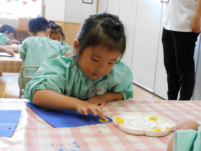 今日はパンダ組のお友達がお月見に向けて制作に取り組みました。     黄色い絵の具でお月様、白い絵の具でお団子を描きました。     お月様の形はどうしようかな・・・  …
