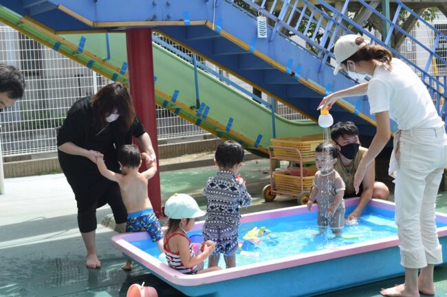 今日は全クラス、プール納めを行いました。 安全に遊べたことに喜びを感じながらプールで遊びました。   保育部さんは模擬の金魚で金魚すくいをしました。 すくいをじっと見たり、ぷかぷか浮…