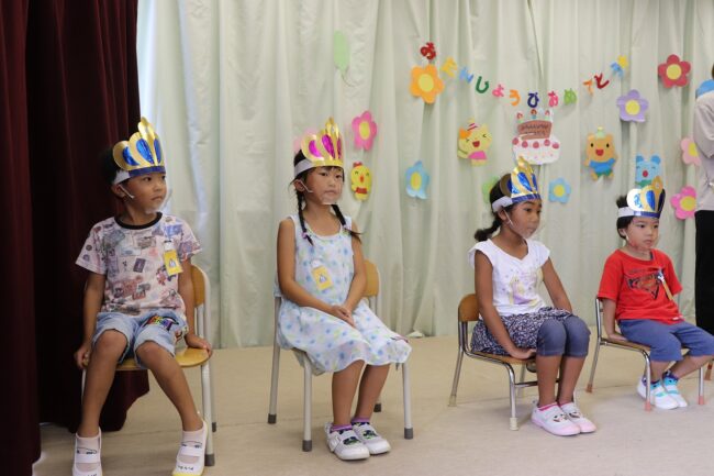 今日は8月のお誕生日会でした 先月にお休みをしていた子も今月の会で参加しました 誕生日のお友達にインタビューをする際に他の友達に聞いて質問に答える こともあり、皆それぞれでどんな質問にしようか考える姿も見られていました …