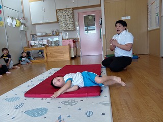 ペンギン組さんは、プチ体操教室がありました(*^^*) みんなでお部屋の中をぐるぐると動いたり マットの上を転がったりしました! くまさん歩きにも挑戦し、先生の真似をして 上手にくまさんで歩いていました(^^)/ 最後に…