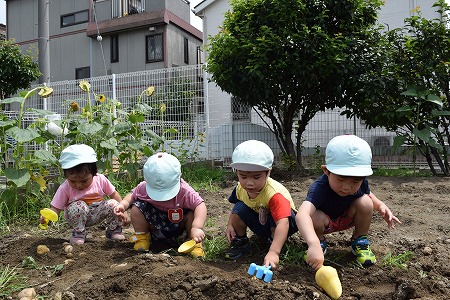 今日保育部のお友達は 雨のため延期になっていたじゃがいもほりを 行ないました! ラッコ組のお友達も先生と一緒に掘り じゃがいもに触れる体験をしました♪ 土やじゃがい…