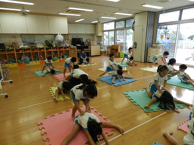 今日は保育部のお友達みんなで リズムを行いました! ピアノの音に合わせて体を動かしていきます♪ 「もしもし カメよ~♪」と歌いながら カメのポーズです☆  …