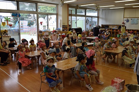 今日は、地域交流会がありました(^^) キリン組とライオン組のお友達でみどりの館に行ってきました☆ 先日のなかよし夏祭りでも行った、「コバトン音頭」と「ドラえもん音…