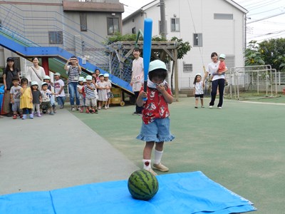 今日は園庭開放でスイカ割りをしました。 たくさんのお友だちが遊びに来てくれました♪ みんな上手にバットを持ってスイカを叩きました。 3歳以上のお友だちは目隠しをして、みんなの応援の中、叩いてい…