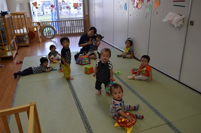 本日ラッコ組さんは午前中はお散歩、午後は室内で遊びました。 最近は知っている人を見付けるとタッチをするために集まってきます。 タッチをするとニッコリとご機嫌になります。(^^)