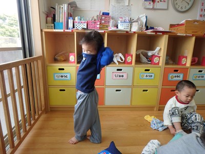 イルカ組さんはお昼寝の際に 1人でお着替えできるように練習中です。 ボタン掛けが出来る子はまだ少ないのですが 頑張って挑戦しています。 お昼寝の後はおいしいおやつです。 明日の英語教室もガンバって行こうね(…