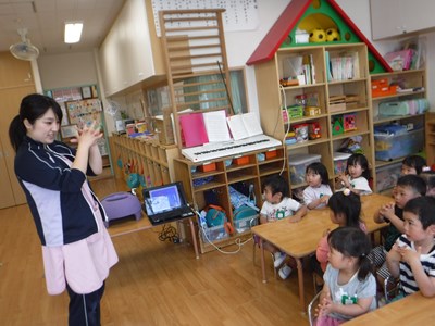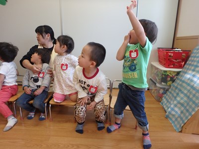 本日は英語教室を行いました。 イルカ組さんもお勉強しましたよ。 「グッモーニン」の挨拶と共に入ってきた先生を迎えます。 まずは横一列になって先生の話を聞きます。 続いて輪になって先生の動きを真似してみますよ。 お勉強の後…