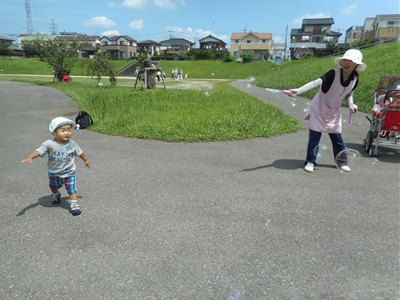 ラッコ組さん@治水緑地公園 夏らしい日差しの下、シャボン玉を追いかけて もう少しで手に届きそう>>> クローバーのお花見て見て♪♪ まぶしい緑、真っ白な雲、ふわふわシャボン玉楽しかった♪! &…