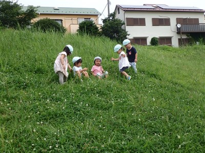 イルカ組さん@治水緑地公園♪♪ 治水緑地公園は草の緑とクローバーの花 がいっぱいです。 バッタを探して「いた、いた!」 手でつかめるよ!! クローバーのお花をたくさん摘んでみたり…