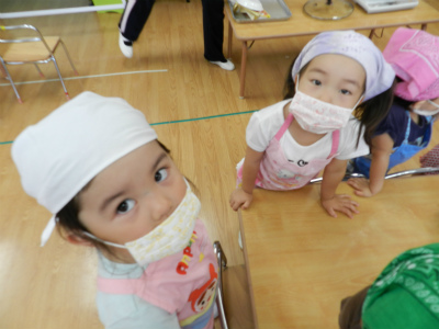 今日はカレーパティーをしましたよ♪ まずは、手洗いをして エプロンと三角巾とマスクをつけて・・・ お友達みんな、エプロン姿がとっても可愛かったです(*^_^*)!! 次に、カレーの作り方を栄養士の先生に 教…