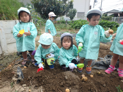 金曜日に出来なかったジャガイモ堀を今日 天気が良かったのですることが出来ました(*^_^*)! 1歳児の子どもから参加しました♪ スモックを着て、帽子を被って、軍手を付けて、スコップを持って 準備は整いました!畑に移動し…