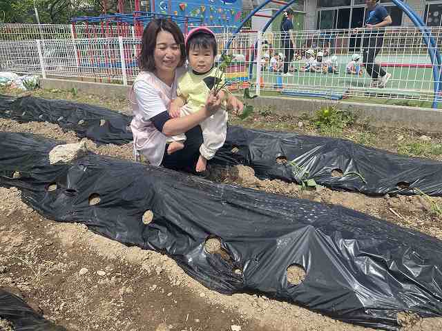 今日はさつまいもの苗の植え付けを行いました。 ラッコ組のお友達も畑に行き、植え付けに参加しました 先生と一緒に葉っぱの感触を感じながら苗を持ちます。 …