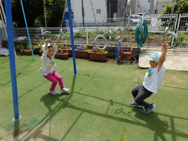 今日パンダ組のお友達は園庭で遊びました! お友達と一緒に三輪車に乗ったり 吊り輪をやったりと それぞれ好きな遊具を楽しんでいました★ &…