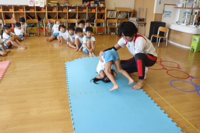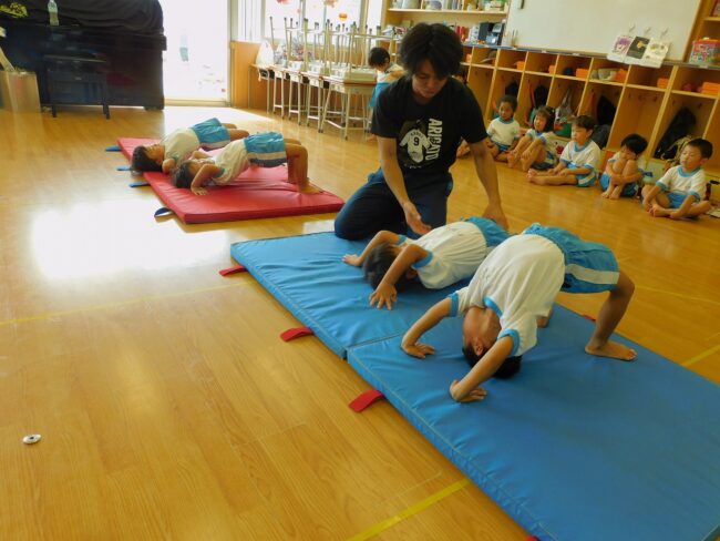 今日はパンダ組の様子です 午前中は体操指導がありました 体操講師のまーくん先生と一緒に 楽しく体操に取り組む姿が見られていました 今回からの体操ではマットを使い ブリッジや前転を行いました ブリッジでは運動会でもキリン、…