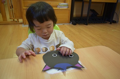 今日は地域交流会を行いました。 まずはじめに、ライオン組のお友達と一緒にぶんぶんゴマの制作を行いました。 地域の方との会話を楽しみながら、回った時の色をイメージし …