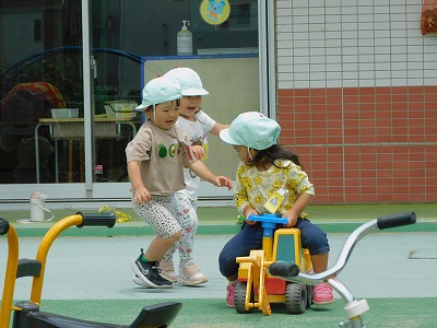 今日はイルカ組のお友達が園周りのお散歩の後園庭で遊びました。 三輪車に乗っているお友達がいると「押してあげる―!」と仲良く遊ぶ姿が見られました。 お砂場ではお皿をたくさん並べてご…