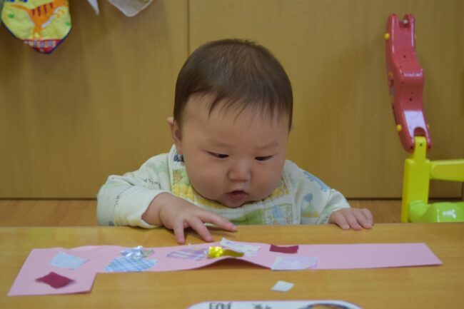 今日はラッコ組の様子です 午前中はお部屋で父の日の制作を行いました きれいな紙を自分の好きなところに「ぺたぺた」と 貼っていきました 画用紙に増えていくきれいな紙を見て、手を叩いて 嬉しさを表現したりしていました 貼る時…