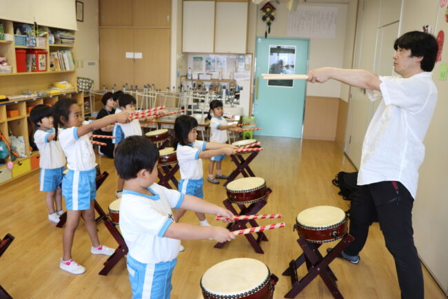 今日は音楽指導がありました。 ライオン組のお友達は、午前中はマーチングの練習で練習の成果を講師の先生に披露しました。 午後は、夏祭りに向けて和太鼓の練習が始まりました。 バチの持…