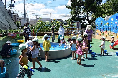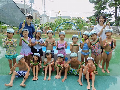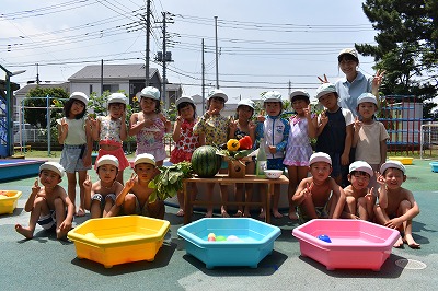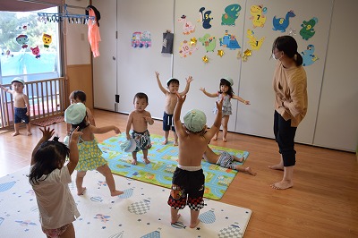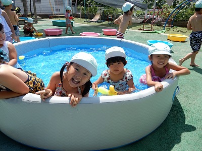 今日、キリン組はプール遊びを行ないました。 お約束事を確認し、プールの始まりです! 大きなプールの中に入り、体をぷかぷか器用に 浮かせたり、友達と水を掛け合ったりし…
