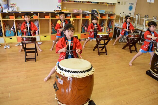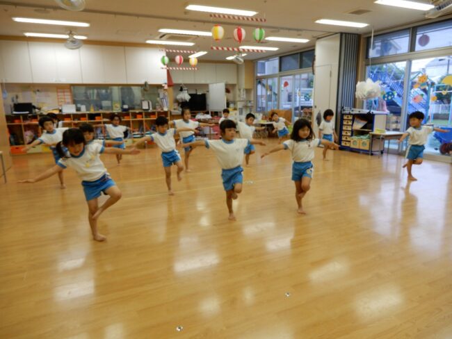 今日はイルカ組~ライオン組のお友達で 夏祭りの練習を行ないました♪ ライオン組のお友達はハッピを着てやりました☆ まずはオープニング太鼓!  …